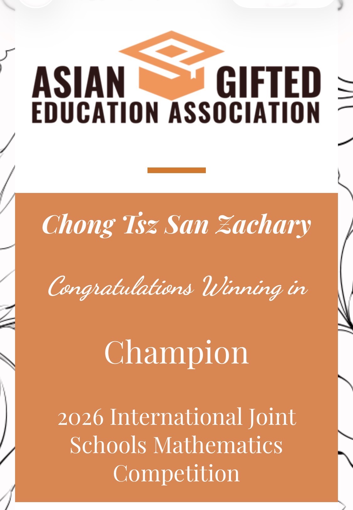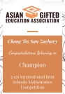 Champion, 2026 International Joint Schools Mathematics Competition (organized by the Asian Gifted Education Association).